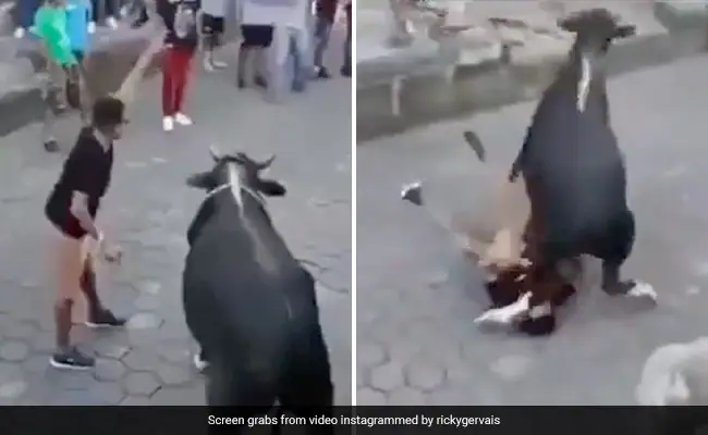 वीडियो फुटेज में ब्लैक टी-शर्ट पहने एक व्यक्ति को बैल के सींग के पास हाथ…