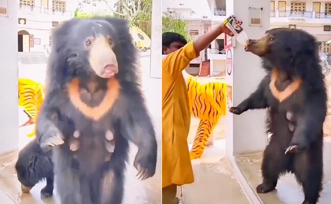 वायरल हो रहे इस वीडियो में एक विशालकाय भालू को जंगलों के बजाए इंसानी बस्ती के बीच देखा जा रहा है. यूं तो भालू बेहद गुस्सैले होते हैं, जो जंगलों में अपने इलाके के अंदर ही रहना पसंद करते हैं. कई बार खाने की तलाश में ये जंगल से इंसानी बस्तियों तक भी पहुंचे जाते हैं. सोशल मीडिया पर अक्सर ऐसे वीडियो देखने को मिलते हैं, जिसमें भालू इंसानों से सामना होने पर हमला करने में नहीं हिचकिचाते. उनके नुकीले नाखून अपने शिकार को बुरी तरह जख्मी करने में सक्षम हैं, लेकिन हाल ही में वायरल इस वीडियो में एक काले रंग के भालू को अपने पैरों पर खड़े होकर इंसानों के सामने बिल्कुल शांत देखा जा रहा है. इस दौरान कुछ लोग भालू को अपने हाथ से कोल्डड्रिंक और जूस पिलाते नजर आ रहे हैं.