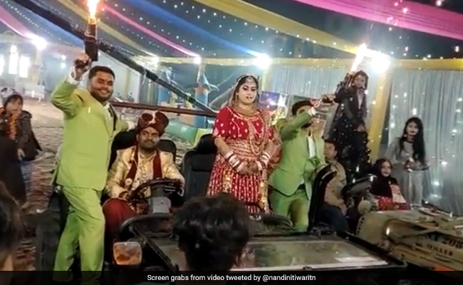 दूल्हा-दुल्हन ने खुली जीप में आतिशबाजी के साथ की धांसू एंट्री
