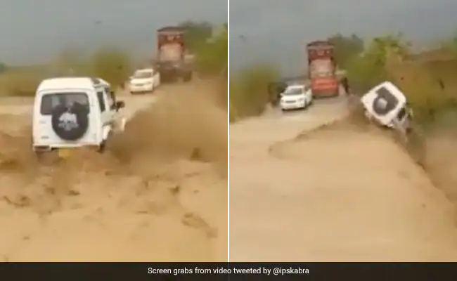 पानी के तेज़ बहाव में भी गाड़ी चलाता रहा ड्राइवर, बैलेंस बिगड़ते ही गहरी खाई में गिरा
