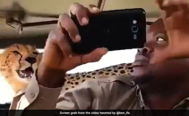 चीता सफारी गाड़ी पर कूदा, सनरूफ पर जैसे ही बैठा, शख्स लेने लगा सेल्फी