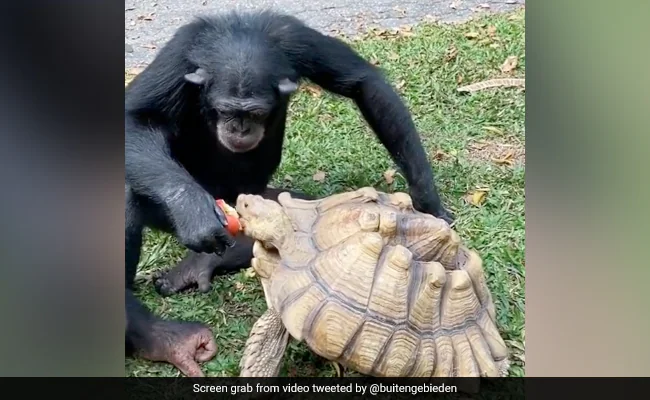 वीडियो की शुरुआत एक चिंपैंजी द्वारा सेब खाने से होती है. काटने के बाद, वह अपने पास बैठे कछुए को सेब खिलाता है. वीडियो में बाद में दो दोस्तों के बगल में बैठा एक और चिंपैंजी कछुए को निहारता हुआ दिखाई दे रहा है.