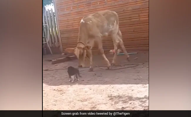बिल्ली ने धीरे से मारा पंजा, अचानक हवा में उछलकर बुरी तरह ज़मीन पर गिरी गाय