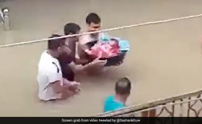 बाढ़ के पानी में चलकर अपने नवजात बच्चे को घर ले आया शख्स