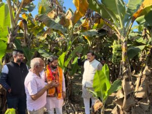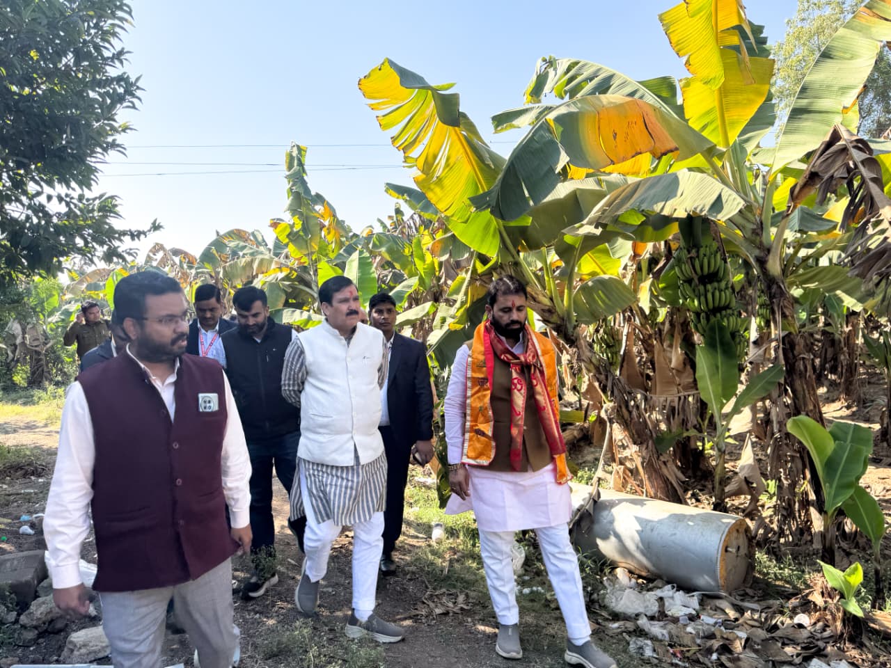 बड़वानी 19 दिसम्बर 2025/जिले के प्रभारी मंत्री एवं प्रदेश के कौशल विकास एवं रोजगार मंत्री डॉ. गौतम टेटवाल ने ठीकरी ब्लॉक के ग्राम मेहगांव डेब में उन्नत किसान श्री शिवचरण नागौर के खेत का भ्रमण किया। मंत्री डॉ. टेटवाल ने श्री नागौर द्वारा अपनाई गई केले की उन्नत किस्म और आधुनिक कृषि तकनीकों की विस्तृत जानकारी प्राप्त की। उन्होंने कहा कि आधुनिक नवाचारों और कड़ी मेहनत के माध्यम से किसान भाई कृषि को आत्मनिर्भर और लाभदायी बना रहे हैं। डॉ. टेटवाल ने प्रगतिशील किसानों के प्रयासों को नमन करते हुए कहा कि श्री नागौर के अनुभव क्षेत्र के अन्य युवाओं और किसानों के लिए प्रेरणादायक हैं।मंत्री जी ने किसान के आत्मीय संवाद और कृषि के प्रति उनके समर्पण की सराहना करते हुए उन्हें भविष्य के लिए शुभकामनाएं दीं। प्रधान संपादक नाज मोहम्मद पायलेट