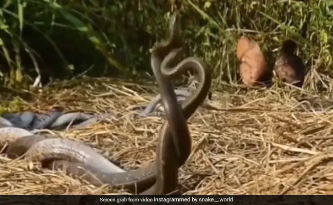 वायरल हो रहे इस वीडियो को देखकर तो किसी के भी रोंगटे खड़े हो जाएंगे. इस वीडियो में दिखाया गया है कि नाग-नागिन हवा में फन लहराते हुए एक दूसरे के साथ लिपटे हुए दिखाई दे रहे हैं. दोनों ही सांप काफी लंबे और विशाल हैं. इन सांपों को देखकर तो कोई भी बता देगा कि ये नाग-नागिन का जोड़ा है. आप देख सकते हैं कि दोनों ही किस तरह एक दूसरे से खतरनाक अंदाज़ में लिपटे हुए हैं और अपने फन को हवा में लहरा रहे हैं.