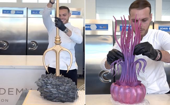 Chef Creates Sacred Trident: सोशल मीडिया पर ज्यादातर लोग खाने के वीडियोज (food videos) देखना पसंद करते हैं. भले ही इनमें से ज्यादातर लोग खाना बनाने के शौकीन नहीं है, बावजूद इसके वो लजीज स्वादिष्ट फूड बनते हुए देखना पसंद करते हैं. यूं तो पकवान बनते देख हर किसी के मुंह में पानी आ जाता है. हाल ही में एक ऐसा ही वीडियो सामने आया है, जिसमें एक पेस्ट्री शेफ (pastry chef) को चॉकलेट (chocolate) से त्रिशूल (Sacred Trident) जैसी आकृति बनाते देखा जा रहा है. दिखने में ये चॉकलेटी त्रिशूल कुछ-कुछ हॉलीवुड फिल्म ‘एक्वामन’ (movie Aquaman) के सेक्रेड ट्राइडेंट के डिजाइन जैसा ही लग रहा है.