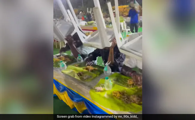 शादी का खाना हर किसी को पसंद होता है. बहुत से लोग शादी में खाना खाने के लिए ही जाते हैं. ऐसे में अगर आप किसी शादी में गए हैं, और खाने के समय पर ही ज़ोर की बारिश हो जाए तो आपका सारा मूड खराब हो जाएगा और खाने का मज़ा भी. सोशल मीडिया पर एक वीडियो वायरल हो रहा है, जिसमें एक शादी के दौरान ज़ोर की बारिश हो गई तो मेहमानों ने खाने के लिए जो किया वो देखकर आपको यकीन नहीं होगा. सोशल मीडिया पर ये मजेदार वीडियो खूब वायरल हो रहा है और बार-बार देखा भी जा रहा है.