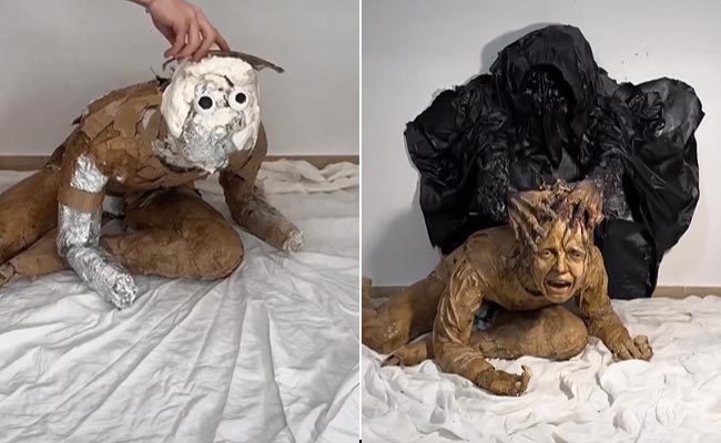 वीडियो में इस कलाकार की कलाकारी देखकर आपकी आंखें भी खुली की खुली रह जाएंगी. वायरल हो रहे इस वीडियो में एक शख्स को कबाड़ की चीजों को जोड़ते हुए एक हैरतअंगेज आर्ट क्रिएट करते देखा जा रहा है. वीडियो में आप देखेंगे कि, कभी वो कार्डबोर्ड, तो कभी प्लास्टिक की बोतलों के साथ फोम का इस्तेमाल कर रहा है और आखिर में वो एक कमाल का पुतला बनाकर तैयार कर देता है, जिसे देखकर आप भी हैरत में पड़ जाएंगे.