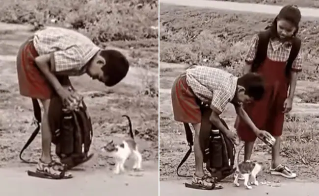आज जब समाज से इंसानियत धीरे-धीरे खत्म होती जा रही है. लोगों ने दूसरों के बारे में सोचना ही छोड़ दिया है. उस परिस्थिति में सोशल मीडिया पर एक ऐसा हार्ट टचिंग वीडियो तेजी से वायरल हो रहा है, जिसे देखकर आपका दिन बन जाएगा. ये वीडियो स्कूल से लौट रहे दो बच्चों का है, जो स्कूल यूनिफार्म पहने हुए नजर आ रहे हैं. उनके पास में एक छोटी सी बिल्ली आसपास फटकता हुआ दिखाई दे रहा है. मानो ये बिल्ली कुछ खाने को मांग रहा हो. उस सड़क से निकलने वाले तमाम लोगों की जब इस बिल्ली पर नजर नहीं पड़ी, तब इन बच्चों ने इंसानियत दिखाई.
