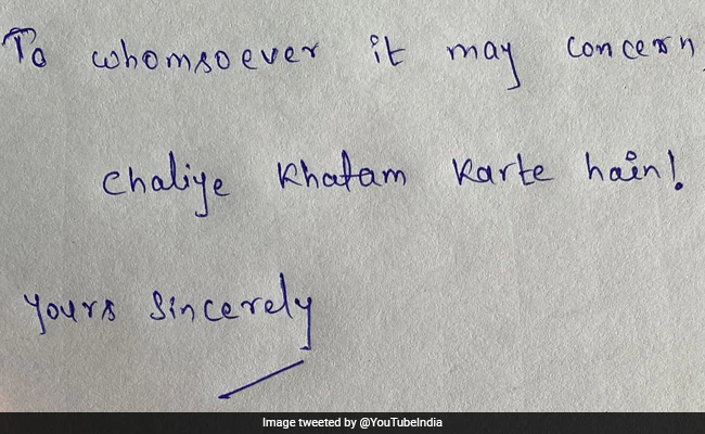 यूट्यूब इंडिया ने अपने ट्विटर हैंडल से एक छोटा लेकिन मजेदार इस्तीफा पत्र शेयर किया है. पत्र में लिखा है, “जिस किसी के लिए भी यह चिंता का विषय हो, चलिए खत्म करते हैं.” पोस्ट के साथ कैप्शन में लिखा है, “अच्छा रेजिग्नेशन लेटर.”
