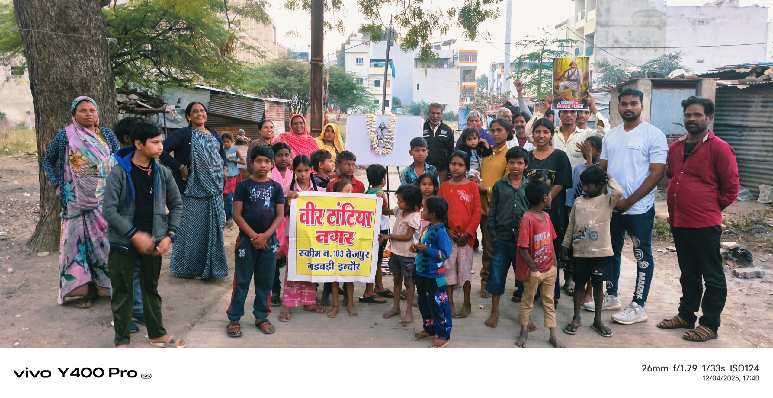 वीर टांटिया नगर, तेजपुर गड़बड़ी इंदौर में जननायक वीर टंट्या भील मामा का शहादत दिवस बड़े ही सम्मान और गर्व के साथ मनाया गया। कार्यक्रम में सभी युवा साथी, बस्ती के लोग और माता सावित्रीबाई फुले पाठशाला के बच्चे बड़ी संख्या में शामिल हुए और उत्साहपूर्वक भाग लिया।