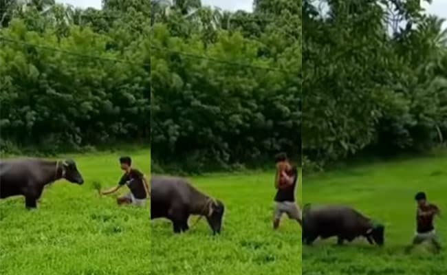 वायरल हो रहे इस वीडियो में आप सबसे पहले फ्रेम में देखेंगे कि एक बड़ा सा खेत है, जहां एक भैंस बंधी हुई है, जिसे एक लड़क घुटने के बल बैठकर, हाथ में घास का बुके लेकर मनाता नजर आ रहा है. वीडियो को देखकर तो ऐसा ही लग रहा है जैसे वो भैंस को प्रपोज कर रहा हो. जब भैंस कोई रिएक्शन नहीं देती तो लड़का उसके सामने मुंह पर दोनों हाथ रखकर (इन दिनों इंस्ट्राग्राम में फेमस एक ट्रेंड पोज पर) डांस करने लगता है. इस दौरान भैंस पर हमला करती नजर आती है. वीडियो को देखकर ऐसा लग रहा है मानों भैंस को लड़के डांस बिल्कुल अच्छा ना लगा हो.