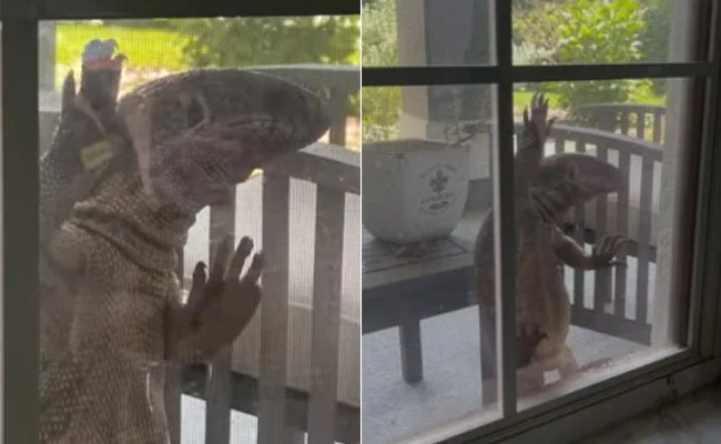 Video:घर का दरवाजा नॉक करते हुए घुसने की कोशिश करती दिखी एक विशाल छिपकली